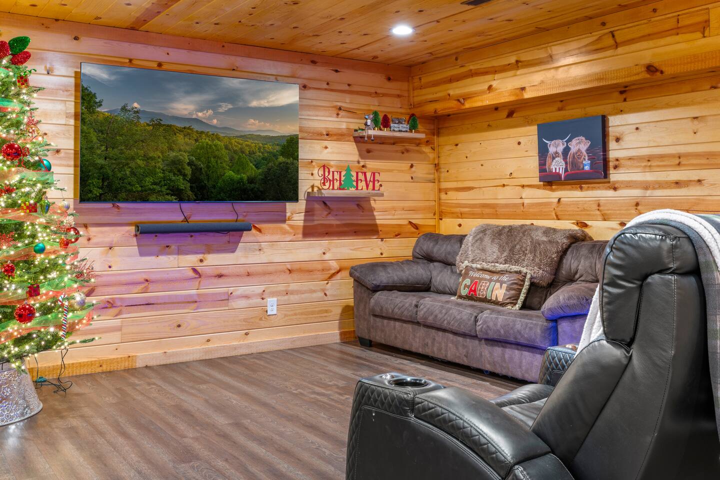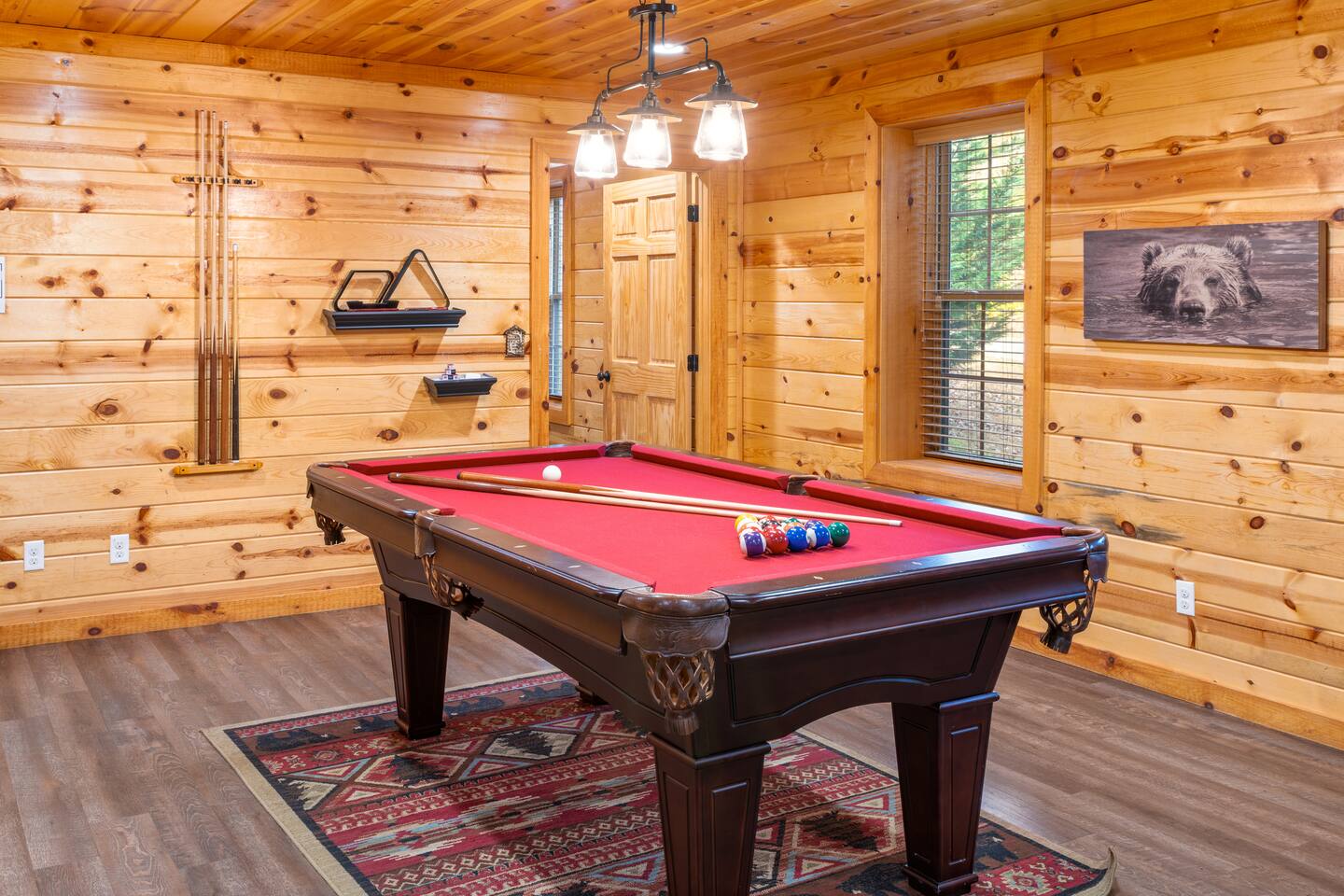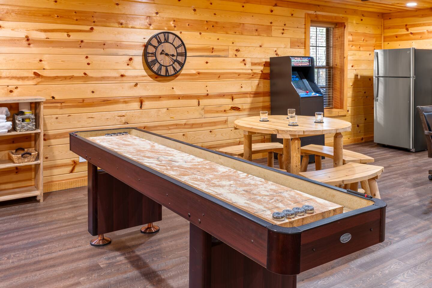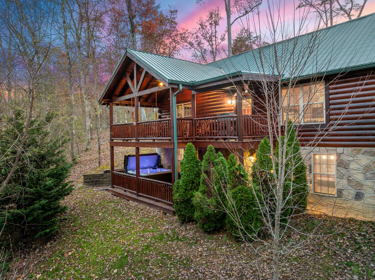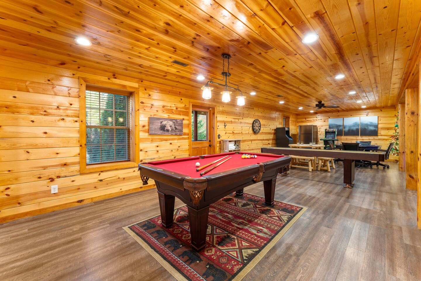Holliebear’s Hideaway — a luxury Smoky Mountain cabin minutes from Dollywood and The Island in Pigeon Forge. Relax in the private hot tub or enjoy the massive game room with pool table, shuffleboard, arcade games, and theater area. Pet-friendly with easy paved access (no steep roads), king suites, cozy decks, and space to sleep 12 comfortably — perfect for families and groups.