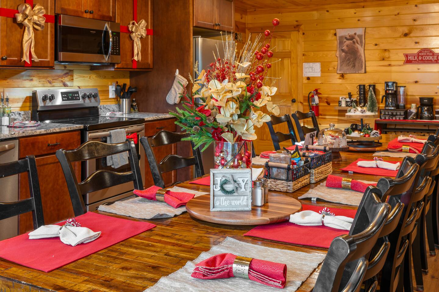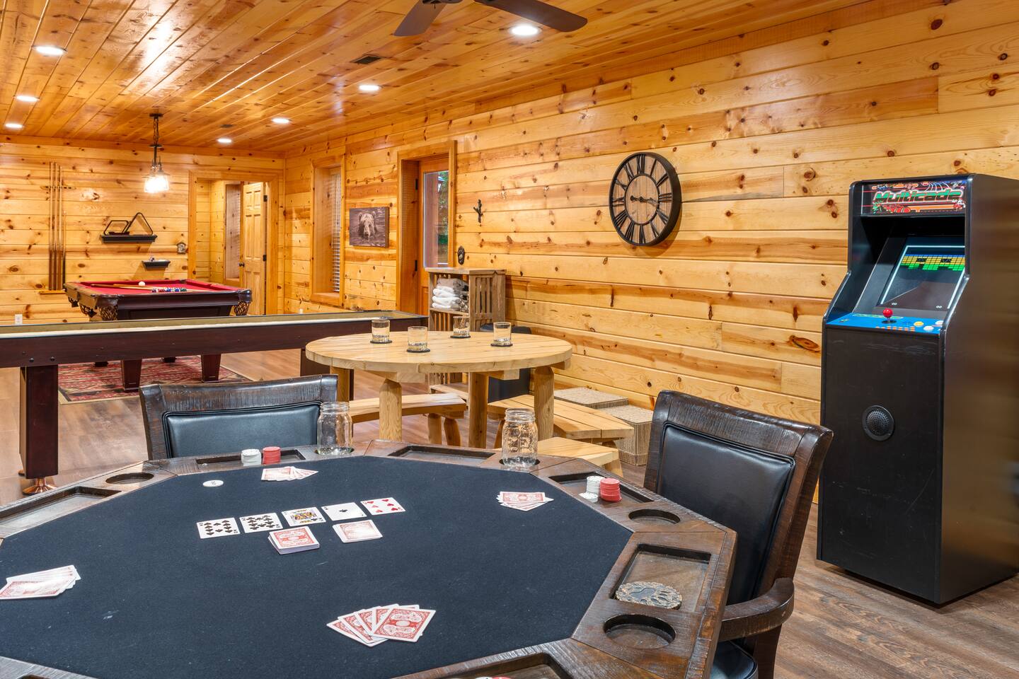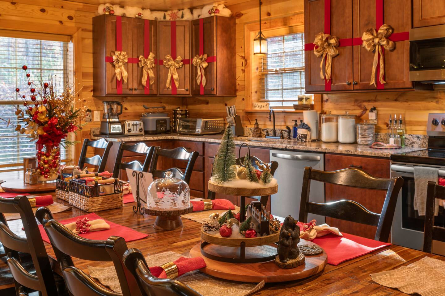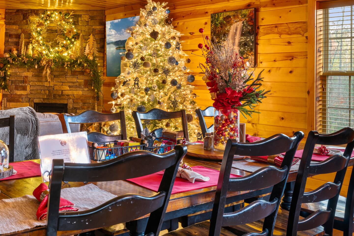 ⭐ At a glance Sleeps 12 | 4 bedrooms / 3.5 baths 2 King suites + queen bedrooms + queen-over-queen bunks Private 6-person hot tub Massive game room + theater area Easy paved access (no steep mountain roads) Pet-friendly (up to 2 dogs) Minutes to Dollywood, The Island & Gatlinburg Welcome to Holliebear’s Hideaway Holliebear’s Hideaway is a 3,240 sq ft luxury log cabin in Pigeon Forge, Tennessee, thoughtfully designed for families and groups. With spacious gathering areas, cozy sleeping arrangements, and endless entertainment, this cabin blends classic Smoky Mountain charm with modern comfort — the perfect home base for your mountain getaway. 📍 Easy Access & Prime Location Only 1 step to enter — no steep stairs or long climbs Paved roads all the way to the cabin High-speed WiFi throughout Conveniently located near top attractions: 5.5 miles to The Island in Pigeon Forge 8.9 miles to Dollywood & Splash Country 7.2 miles to Tanger Outlets 13.3 miles to Gatlinburg 14.3 miles to Smoky Mountain Knife Works Enjoy a peaceful resort setting while staying just minutes from the action. 🛏️ Layout & Sleeping Arrangements Main Level (no interior stairs once inside): Open-concept living room with gas fireplace, large smart TV & surround sound Fully stocked gourmet kitchen Dining table seating 12 Upper deck with gas grill, rocking chairs & porch swing King master suite with private bath 2 queen bedrooms 2 full bathrooms Lower Level: Second king master suite with private bath Queen-over-queen bunk beds in the game room Game room & theater area 1 full bathroom + 1 half bath Laundry room with full-size washer & dryer (starter detergent provided) 🎮 Game Room & Entertainment The lower-level game room is a guest favorite and perfect for all ages: Pool table Shuffleboard table 2 arcade machines (classic games + TMNT) Card / poker table with chips and decks Board games for family game nights Dedicated theater area with large TV & surround sound Full-size refrigerator for drinks & snacks 🍳 Kitchen & Coffee Bar The gourmet kitchen is fully equipped for cooking and entertaining: Brand-new appliances and cookware Ninja air fryer / toaster oven, blender & multi-cooker Bakeware, utensils, dishes & glassware for 12+ Full-size refrigerator with Brita pitcher Coffee, Tea & Hot Chocolate Bar includes: Dual-brew coffee maker (grounds or pods) K-cups, hot chocolate, tea & cider Creamers, sweeteners & essentials (starter supply) 🌲 Outdoor Living Two spacious decks with comfortable seating Gas grill on the upper deck Rocking chairs & porch swing — perfect for morning coffee Private hot tub on the lower deck (open year-round) Seasonal resort pool access: Memorial Day through Labor Day 10:00 AM – 10:00 PM (weather permitting) 🧺 Thoughtful Amenities Fresh linens & starter bath towels Starter toiletries & paper products Smart TVs in all bedrooms, living room & game room Central heat & air Iron, ironing board & hair dryers Pack-N-Play for little guests Pet-friendly (up to 2 dogs, fee applies) 🎄 Holiday Magic (November – January) During the holiday season, the cabin is beautifully decorated with: Two fully decorated Christmas trees Twinkling lights, garland & festive touches Cozy seasonal décor throughout the cabin A place to relax, reconnect & make memories Holliebear’s Hideaway isn’t just a cabin — it’s a place to slow down, have fun, and create lasting memories. From mornings on the porch to late-night hot tub soaks and game room laughs, every detail is designed for comfort, connection, and joy. Book today and experience the best of Pigeon Forge in style.