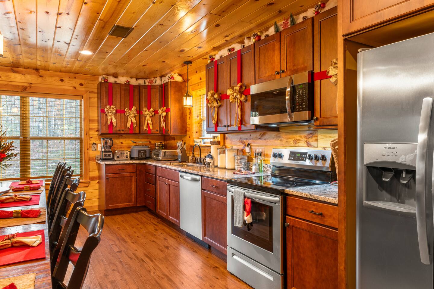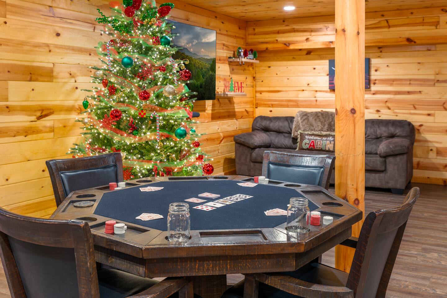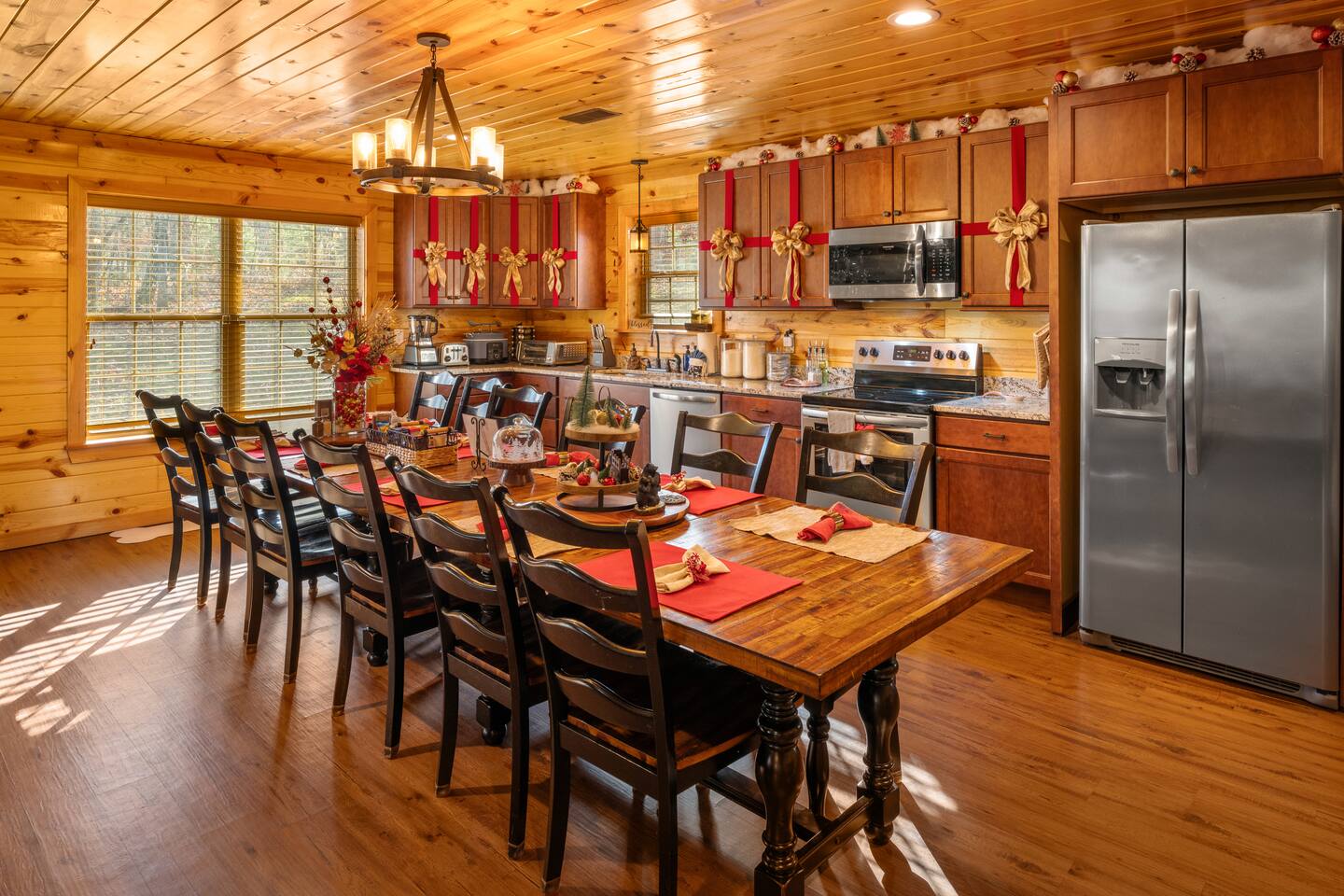 ⭐ At a glance Sleeps 12 | 4 bedrooms / 3.5 baths 2 King suites + queen bedrooms + queen-over-queen bunks Private 6-person hot tub Massive game room + theater area Easy paved access (no steep mountain roads) Pet-friendly (up to 2 dogs) Minutes to Dollywood, The Island & Gatlinburg Welcome to Holliebear’s Hideaway Holliebear’s Hideaway is a 3,240 sq ft luxury log cabin in Pigeon Forge, Tennessee, thoughtfully designed for families and groups. With spacious gathering areas, cozy sleeping arrangements, and endless entertainment, this cabin blends classic Smoky Mountain charm with modern comfort — the perfect home base for your mountain getaway. 📍 Easy Access & Prime Location Only 1 step to enter — no steep stairs or long climbs Paved roads all the way to the cabin High-speed WiFi throughout Conveniently located near top attractions: 5.5 miles to The Island in Pigeon Forge 8.9 miles to Dollywood & Splash Country 7.2 miles to Tanger Outlets 13.3 miles to Gatlinburg 14.3 miles to Smoky Mountain Knife Works Enjoy a peaceful resort setting while staying just minutes from the action. 🛏️ Layout & Sleeping Arrangements Main Level (no interior stairs once inside): Open-concept living room with gas fireplace, large smart TV & surround sound Fully stocked gourmet kitchen Dining table seating 12 Upper deck with gas grill, rocking chairs & porch swing King master suite with private bath 2 queen bedrooms 2 full bathrooms Lower Level: Second king master suite with private bath Queen-over-queen bunk beds in the game room Game room & theater area 1 full bathroom + 1 half bath Laundry room with full-size washer & dryer (starter detergent provided) 🎮 Game Room & Entertainment The lower-level game room is a guest favorite and perfect for all ages: Pool table Shuffleboard table 2 arcade machines (classic games + TMNT) Card / poker table with chips and decks Board games for family game nights Dedicated theater area with large TV & surround sound Full-size refrigerator for drinks & snacks 🍳 Kitchen & Coffee Bar The gourmet kitchen is fully equipped for cooking and entertaining: Brand-new appliances and cookware Ninja air fryer / toaster oven, blender & multi-cooker Bakeware, utensils, dishes & glassware for 12+ Full-size refrigerator with Brita pitcher Coffee, Tea & Hot Chocolate Bar includes: Dual-brew coffee maker (grounds or pods) K-cups, hot chocolate, tea & cider Creamers, sweeteners & essentials (starter supply) 🌲 Outdoor Living Two spacious decks with comfortable seating Gas grill on the upper deck Rocking chairs & porch swing — perfect for morning coffee Private hot tub on the lower deck (open year-round) Seasonal resort pool access: Memorial Day through Labor Day 10:00 AM – 10:00 PM (weather permitting) 🧺 Thoughtful Amenities Fresh linens & starter bath towels Starter toiletries & paper products Smart TVs in all bedrooms, living room & game room Central heat & air Iron, ironing board & hair dryers Pack-N-Play for little guests Pet-friendly (up to 2 dogs, fee applies) 🎄 Holiday Magic (November – January) During the holiday season, the cabin is beautifully decorated with: Two fully decorated Christmas trees Twinkling lights, garland & festive touches Cozy seasonal décor throughout the cabin A place to relax, reconnect & make memories Holliebear’s Hideaway isn’t just a cabin — it’s a place to slow down, have fun, and create lasting memories. From mornings on the porch to late-night hot tub soaks and game room laughs, every detail is designed for comfort, connection, and joy. Book today and experience the best of Pigeon Forge in style.